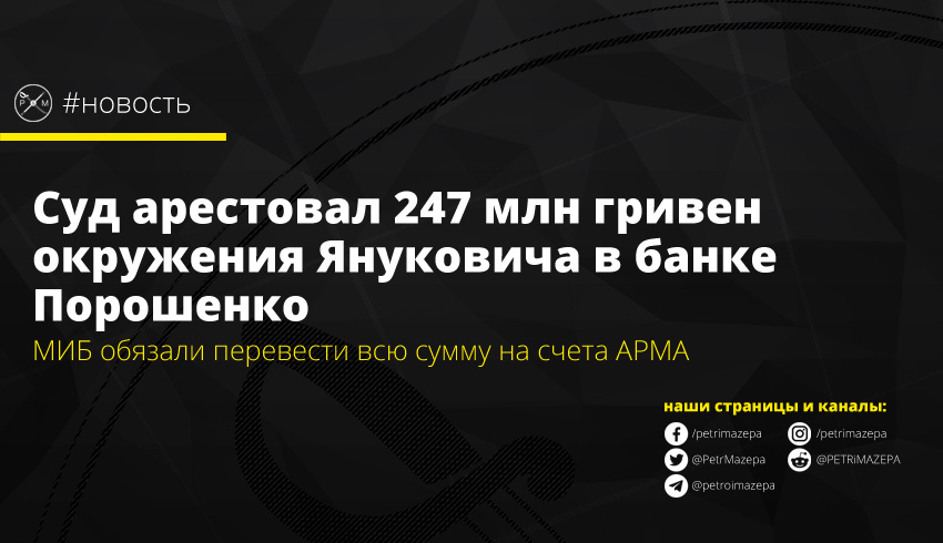 Суд арестовал 247 млн грн на счетах ПАО «Международного инвестиционного банка» (МИБ), которые принадлежали ПАО «Всеукраинский банк развития» (ВБР) семьи Виктора Януковича. Банк МИБ Порошенко суд обязал перечислить эти средства на счета нацагентства по управлению арестованными активами (АРМА).