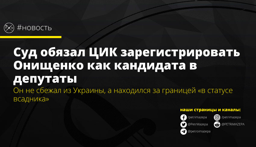 Шестой апелляционный административный суд Киева поддержал ходатайство беглого нардепа Александра Онищенко, и обязал ЦИК зарегистрировать его в качестве кандидата на парламентских выборах. Ранее ему отказали, потому что Онищенко не проживал на территории Украины 5 лет, но кандидат заявил, что в РФ представлял интересы нашей страны и находился «в статусе всадника». Суд счел эту причину уважительной.