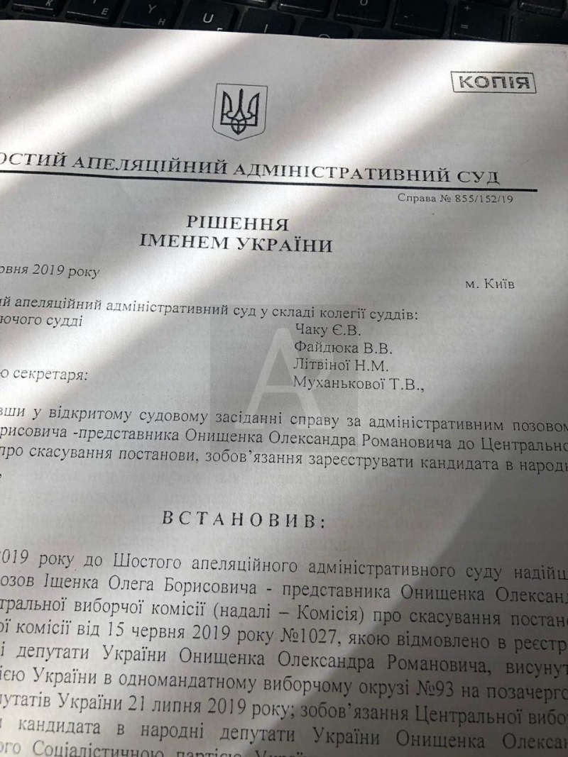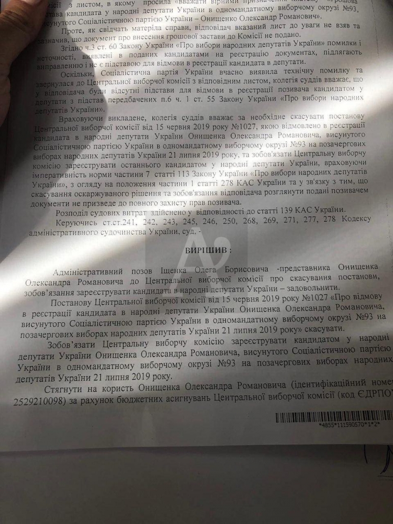 Об этом сообщает издание «Апостроф», предоставляя фотографии копии решения суда. Там указано, что суд обязал зарегистрировать Онищенко как кандидата, а причины его отсутствия в Украине счет уважительными. Отмечается, что Онищенко идет по 93-му округу, по которому он баллотировался и ранее, а также что он выдвигается от Социалистической партии.