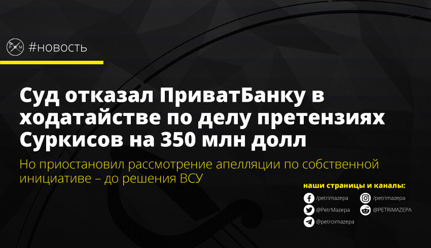 Сегодня, 29 октября, Киевский апелляционный суд принял решение отказать в ходатайстве ПриватБанка о приостановлении действия/выполнения Печерского районного суда Киева от 2 сентября о принудительном исполнении решения этого же суда с 2017 года про обязательства государственного ПриватБанка обслуживать депозиты компаний братьев Суркисов.