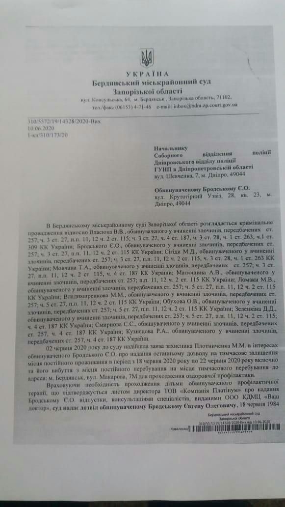 Об этом сообщается в постановлении суда, которое изданию Hromadske предоставили побратимы убитого ветерана. Отмечается, что в суд обратился адвокат обвиняемого, подчеркнув, что Бродскому с детьми надо пройти «оздоровление» в городе Бердянск. По указанному адресу находится база отдыха Sun Resort.