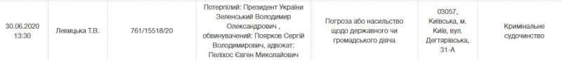 Заседание назначено на 30 июня, 13:30, сообщается на официальном сайте Шевченковского райсуда.