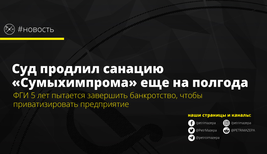 В 2011 году завод был признан должником. Его долг – 1,4 млрд грн. В 2012 году началась процедура санации «Сумыхимпром». Фонд госимущества в 2015 году подал в суд о прекращении банкротства «Сумыхимпром». Четыре судебные инстанции, последней из которых был Верховный суд, ФГИУ проиграл. В 2018 году правительство внесло «Сумыхимпром» в перечень объектов для приватизации, но через суды предприятие отменило это решение. В 2019 году предприятие было внесено в список повторно.
