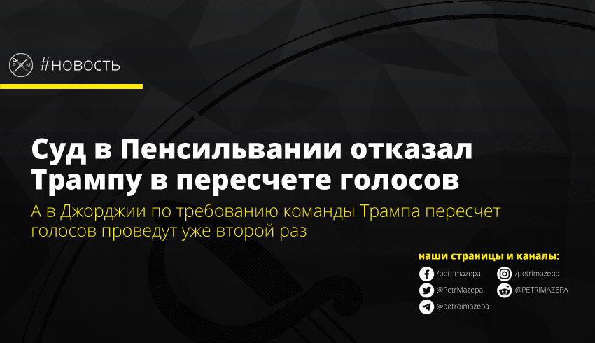 Суд Пенсильвании отказал президенту Дональду Трампу, который требует пересчета голосов на недавних выборах. В Джорджии же планируется еще один пересчет провести – поскольку разница составляет до сих пор менее одного процента, президент Трамп имеет право потребовать еще одного пересчета, но по данным СМИ, это скорее всего не изменит результат.
