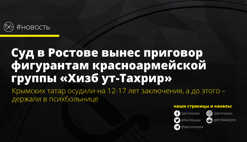 - 16 сентября в российском Ростове-на-Дону вынесли приговор семерым крымским татарам, которых российское кривосудие обвиняет в организации и участии в бахчисарайской ячейке организации «Хизб ут-Тахрир». Мужчины получили от 13 до 19 лет заключения.