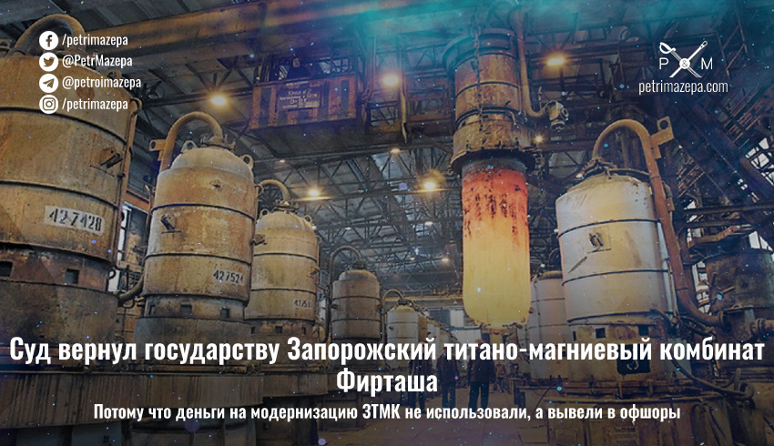 - В июле 2018 года Хозяйственный суд Запорожской области удовлетворил иск САП и постановил вернуть государству имущество ЗТМК, единственного в Европе производителя губчатого титана.