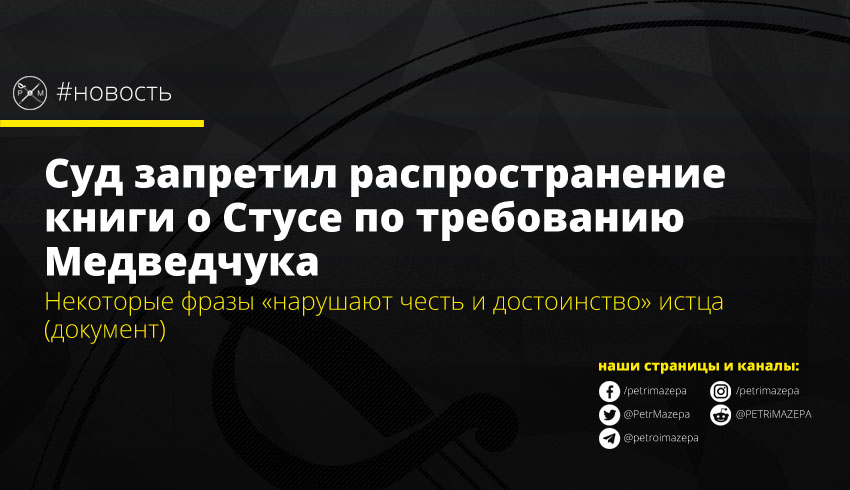 Об этом сообщает сам автор книги в Facebook. Он также поделился фотографией решения суда. Согласно тексту документа, требования истца удовлетворены частично, три эпизода из книги признаны недостоверными и нарушающими права Медведчука «на уважение к достоинству, чести, неприкосновенности и деловой репутации», еще три эпизода признаны нарушающими личное право на использование имени Медведчука без его личного согласия. Фрагменты суд обязал удалить. Распространение напечатанного тиража книги запрещено до «устранения нарушения» прав истца, а при распространении данных о книге запрещено использовать данные из разделов, где по мнению суда нарушаются права Медведчука.