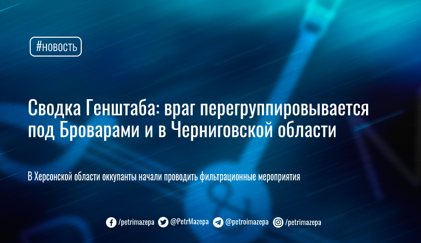 Российские оккупационные войска продолжают перегруппировку с целью возобновления наступательных действий в направлении Броваров Киевской области, а также – в Черниговской области. На Донбассе противник все еще пытается взять ряд населенных пунктов, на Херсонщине – начал фильтрационные мероприятия, а по всей Украине россияне продолжают наносить ракетно-бомбовые удары по гражданской инфраструктуре.