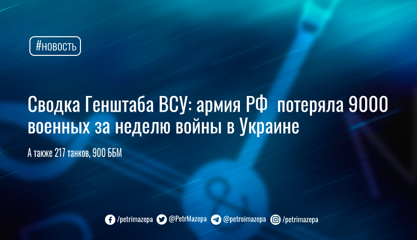 Сводка Генштаба ВСУ: армия РФ потеряла 9000 военных за неделю войны в Украине
