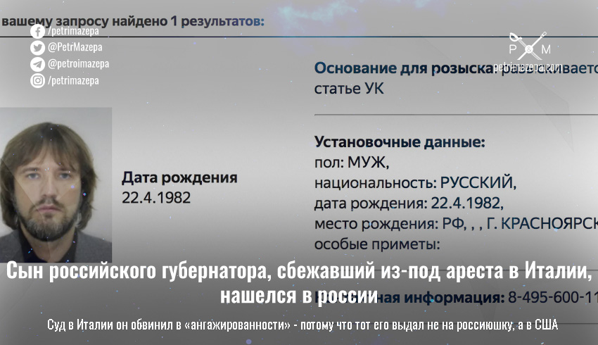 Сын российского губернатора, сбежавший из-под ареста в Италии, нашелся в россии