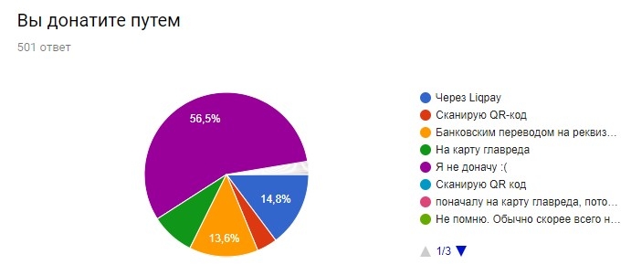 Среди путей доната наиболее популярным является Liqpay, затем банковский перевод на реквизиты и карточка главреда. QR-код потихоньку отвоёвывает позиции у более древних вариантов.