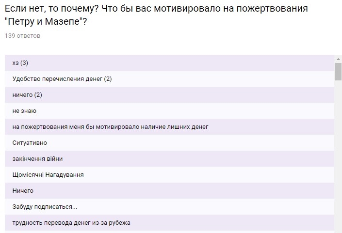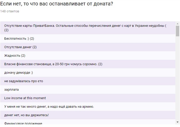 Остальные 18% пошли на частные ответы — о причинах, других проектах, согласии на подписку в пределах 50-200 грн, несогласии платить вообще и т.д и т.п.