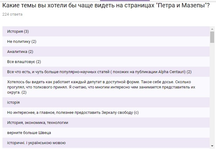 Среди желательных и приоритетных тем вы указали: историю, не политику, аналитику, научно-популярные статьи (похожие на публикации Alpha Centauri), оценку работы отдельных депутатов с привязкой к округам, больше Швеца и Ронина, свежих идей государственного строительства и многое другое.
