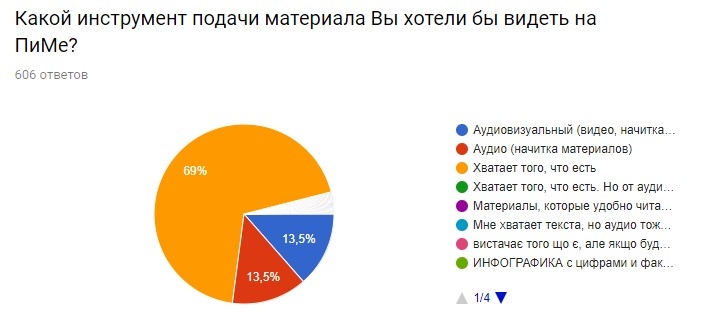 За внедрение аудиоформата или аудиовизуальной подачи высказалось только по 13,5%, а подавляющее большинство 69% удовлетворено имеющимся ассортиментом способов донесения информации. Так что если новые формы подачи материала и появятся в ближайшем будущем, то будут они в виде пробников и явно без допзатрат (тут бы уже имеющиеся потребности закрыть).