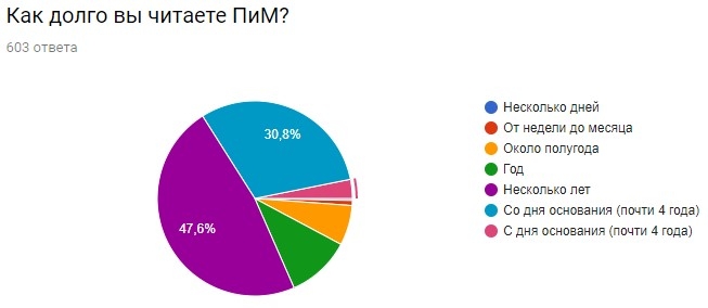 Среди дошедших до опроса — большинство аксакалы на просторах ПиМ. 47,7% читают нас несколько лет, а еще 33,9% — вообще со дня основания ресурса (то есть 4 с лишним года).