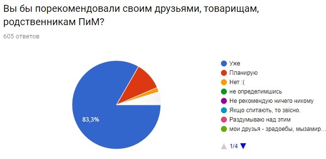 83,3% принявших участие в опросе уже порекомендовали нас своим друзьями, товарищам, родственникам и до сих пор живы. Мы рады, что настолько выделяемся среди сотен других украинских сайтов. Рекомендуют нас не только постоянные читатели, но и те, кто узнал о ПиМ сравнительно недавно. Естественно, тут не всё гладко и 1,7% ответило «нет», плюс ещё несколько человек описали нам причины подробнее в разделе «другое» (да, мы изучили все варианты ответов, даже про ibigdana и «вдруг вы скурвитесь»).