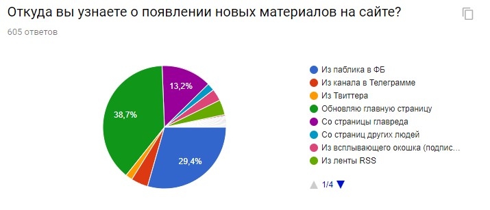 Но суммарное значение «Паблика в ФБ» и «Со страницы главреда» немного превышает количество любителей нажать F5. RSS, push-уведомления, Телеграм и Твиттер имеют свою небольшую, но уникальную категорию пользователей.