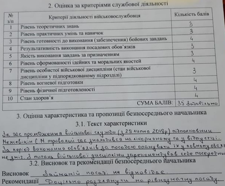 Как написал в оценочной карточке военнослужащего непосредственный начальника Адама Начальник управления подготовки - заместитель командира по подготовке полковник С. Литвинов, Межевикин за время прохождения военной службы «длительное время находился на больничном и в отпуске». А также - не смог в полном объеме освоить обязанности своей должности и имел средние показатели по дисциплине. Судя с поставленных оценок, Литвинов в принципе воспринимает Адама как кого-то сильно усредненного.