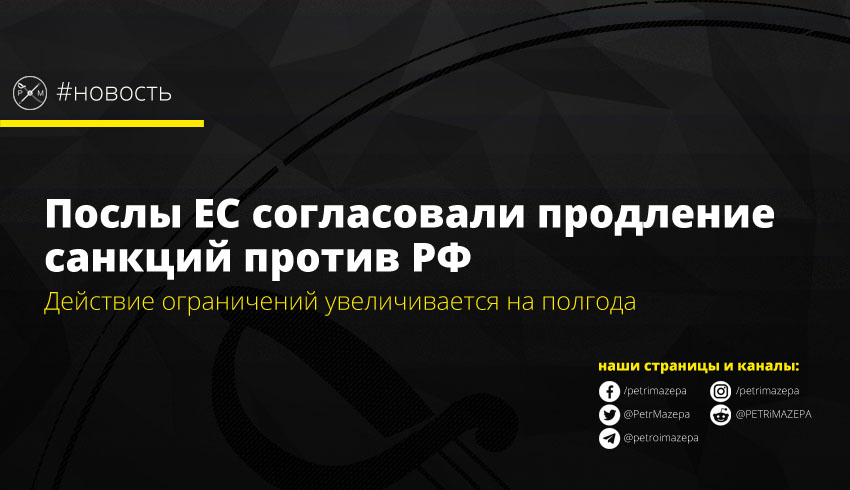 «Постоянные представители 28 стран - членов Евросоюза согласовали продление на полгода ограничительных мер в отношении физических и юридических лиц РФ, срок действия которых истекает 15 сентября», - сообщило россСМИ «ТАСС» со ссылкой на источник в Совете ЕС.
