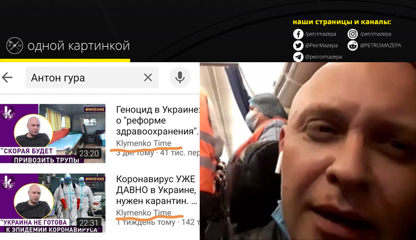 Автором разлетевшегося вчера по интернетам видео, на котором телеведущая плюсов на глазок смогла найти нескольких больных коронавирусом, является Антон Гура. Он баллотировался в Киевсовет от Укропа, а последнее время живет на канале Klymenko time, который финансирует экс-министр доходов и сборов времен Виктора Януковича. Там Гура рассказывает страшилки про медреформу и коронавирус. Подробнее об этом «эксперте» написал в Facebook журналист Евгений Будерацкий.