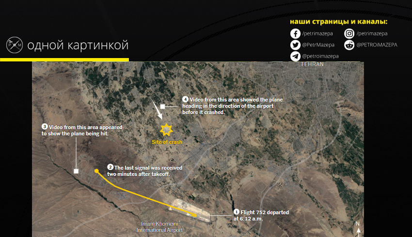 Сначала можно увидеть взрыв после того, как похожий на ракету объект ударил по самолету над городом Паранд, расположенным недалеко от аэропорта, но самолет не взорвался, а летел еще несколько минут, передает The New York Times. Самолет развернулся в сторону аэропорта и в это время уже прекратил передачу своего сигнала. Но через несколько минут борт взорвался, как показали другие видео, подтвержденные американским изданием.