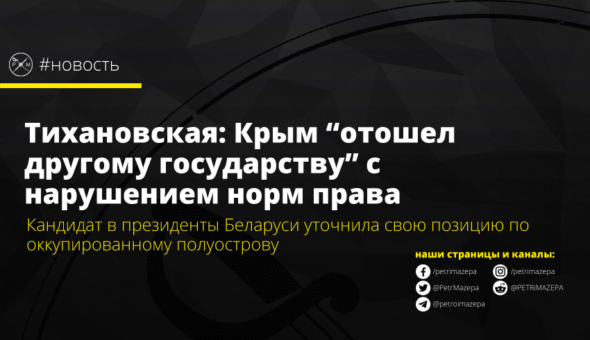 Кандидат в президенты Беларуси Светлана Тихановская уточнила свою позицию относительно украинского Крыма. В интервью литовскому СМИ она заявила, что полуостров «отошел другому государству» с нарушением норм международного права.