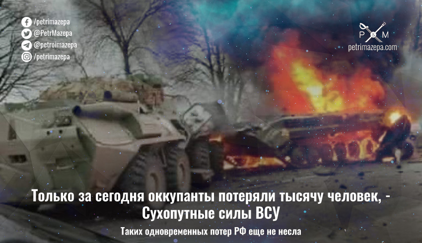 Сухопутные силы ВСУ сообщают, что только за сегодня количество потерь со стороны оккупационных войск Российской Федерации составляет более тысячи человек.