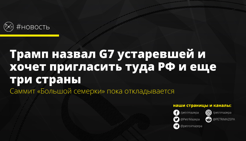Трамп заявил, что считает G7 очень устаревшей группой стран, сообщает CNN. «Я откладываю его, потому что я не чувствую, что надлежащим образом представляет то, что происходит в мире. Это очень устаревшая группа стран», - сказал Трамп. При этом он анонсировал приглашение на саммит еще четырех страны. Речь идет о России, Австралии, Индии и Южной Корее. Таким образом Трамп хочет превратить G7 в G11.