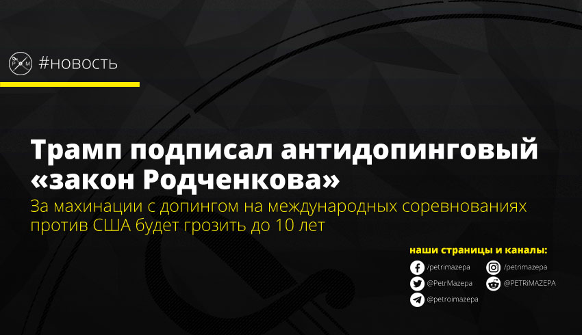 Президент США Дональд Трамп подписал антидопинговый закон, названный именем бывшего директора Московской антидопинговой лаборатории Григория Родченкова. Им предусматривается до десяти лет лишения свободы для тех, кто участвовал в допинговом сговоре на международных соревнованиях, где принимают участие спортсмены из США.