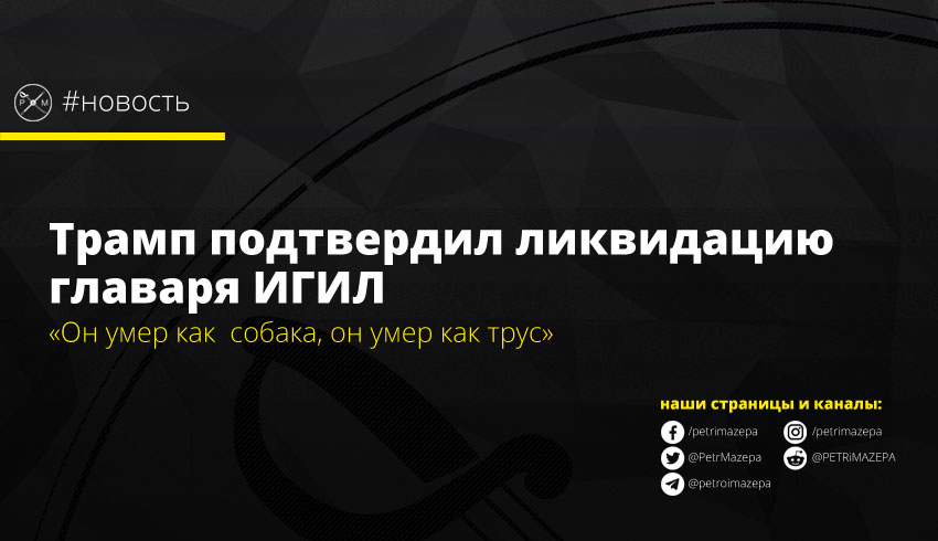 Президент США Дональд Трамп подтвердил, что главарь ИГИЛ Абу Бакр аль-Багдади был ликвидирован на севере Сирии. По словам президента, лидер исламистов подорвал себя и своих троих детей гранатой, когда понял, что его загнали в тупик.