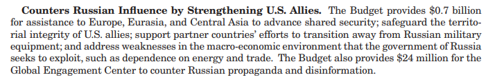 Полный проект доступен по ссылке. Одним из пунктов бюджета стала просьба о выделении 700 миллионов долларов на противодействие «российскому влиянию». Эти деньги направят союзникам США в странах Европы и Азии для укрепления общей безопасности и защиты территориальной целостности. Кроме того, часть средств планируется выделить на поддержку отказа от российского вооружения и снижения зависимости от энергетики из РФ.