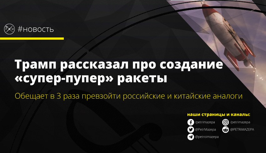 На презентации флага космических сил США президент страны Дональд Трамп сообщил, что дал зеленый свет проекту разработки «супер-пупер» ракеты (super-duper-missile). Этот проект должен создать ракету, которая будет в три раза быстрее российских или китайских аналогов.