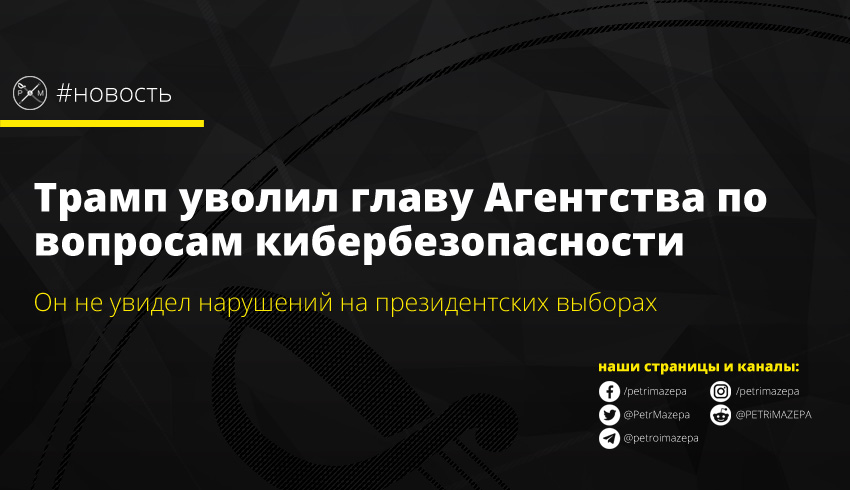 Президент США Дональд Трамп уволил главу Агентства по вопросам кибербезопасности и инфраструктуры США Криса Кребса. Причины - его высказывания относительно того, что во время президентских выборов не было нарушений.
