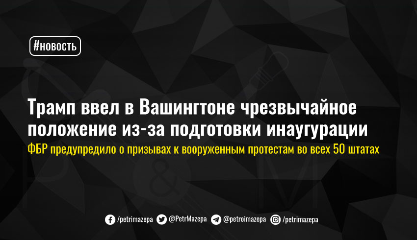 «Сегодня президент Дональд Трамп объявил, что в округе Колумбия вводится чрезвычайное положение, и приказал направить федеральную помощь в дополнение к усилиям города по реагированию на чрезвычайную ситуацию, которая возникла в связи с 59-й инаугурацией президента с 11 по 24 января», - сообщается в официальном пресс-релизе на сайте Белого дома.