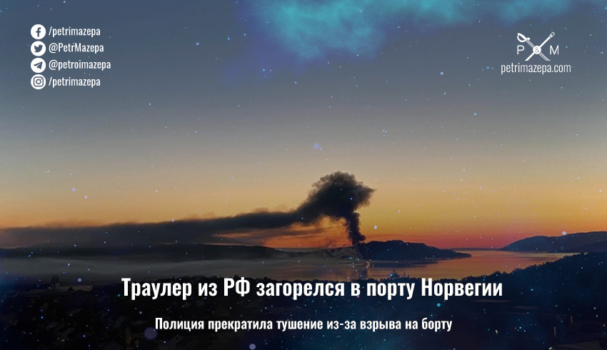 В порту Киркенес, Норвегия, загорелся российский траулер «Таманго». Судно отбуксировали из порта, тушение пожара было прекращено из-за взрывов, но в РФ утверждают, что проблема была только в коротком замыкании и пожар уже потушен.
