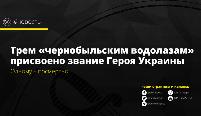 Президент Владимир Зеленский подписал указ «О присвоении звания Героя Украины» трем ликвидаторам аварии на ЧАЭС. Ананенко, Беспалов и Баранов, более известные как «чернобыльские водолазы», после аварии спустились в бассейн-барботер под разрушенным реактором, чтобы выпустить воду и предотвратить возможный повторный взрыв.