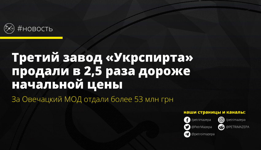 22 октября 2020 успешно состоялся приватизационный аукцион, на котором был продан Овечацкий МОД (место осуществления деятельности и хранения спирта), цена за который выросла со стартовых 19,8 млн грн до 53 млн 100 грн.