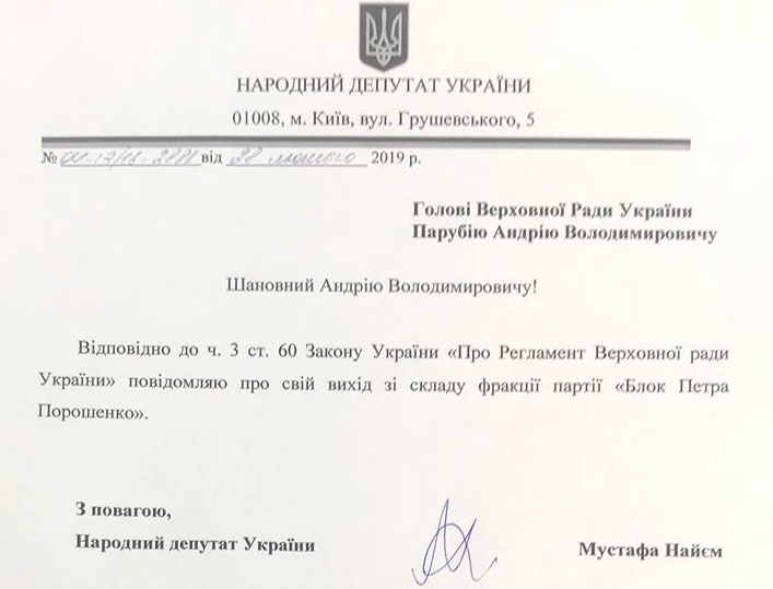 Народный депутат Мустафа Найем подал заявление о выходе из парламентской фракции «Блок Петра Порошенко». Также аналогичные действия предприняли Сергей Лещенко и Светлана Залищук.