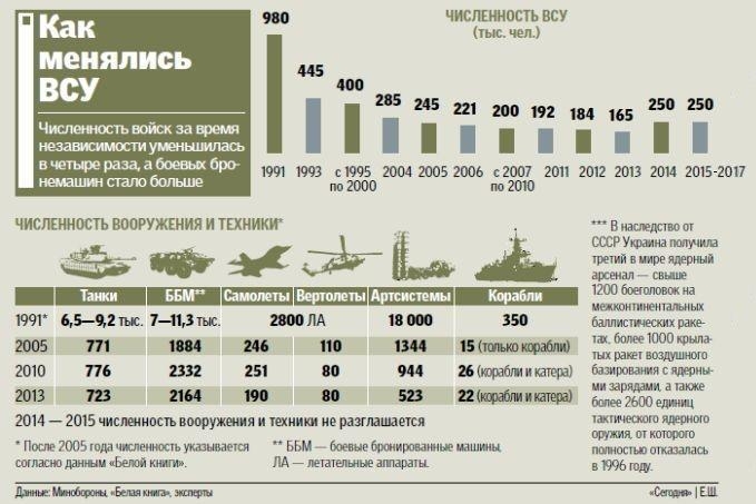 Всё понятно, когда речь идет о массовом разоружении при В.Януковиче, мелком бандите, оказавшемся у руля государства при поддержке России и ставшем политической марионеткой Кремля. Но совсем другое дело, когда во главе государства стоят патриоты. С 2014 года Украина достигла ощутимых успехов в деле восстановления и перевооружения армии. Численность армии была увеличена до 250 тыс. чел., включая 204 тыс. военнослужащих, а в октябре 2017 г. заместитель министра обороны Игорь Павловский предложил увеличить армию ещё на 10-20 тыс. чел. для укомплектования военных частей и охраны арсеналов. Фактически численность армии на данный момент доведена до уровня 2005 года. Правда, при этом стоит учитывать уменьшение населения за этот период с 47,1 до 42,4 млн чел. Однако коэффициент «военной напряжённости населения» (коэффициент действующих военных на каждых 1000 граждан страны) остается относительно низким — всего 3,25. Для сравнения, для США этот показатель равен 4,76, для Германии — 3,45, Великобритании — 3,15, Испании — 3,49, России — 17,93.