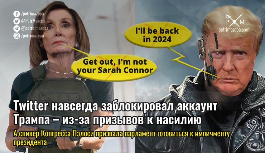 Социальная сеть Twitter навсегда заблокировала аккаунт @realDonaldTrump, принадлежащий президенту США. Его обвиняют в подстрекательстве к насилию и риске разжигания розни. В Конгрессе также заявили, что президент Трамп может быть причастен к подстрекательству к мятежу – поэтому спикер Пелоси призвала парламент готовиться к импичменту, если Трамп сам не уйдет в отставку.