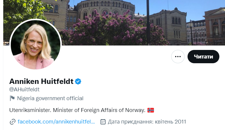 Twitter обозначил учетные записи премьер-министра Норвегии Йонаса Гара Стере, Министерства иностранных дел Норвегии и главы министерства Анникен Гуйтфельдт как государственные учреждения Нигерии. Об этом сообщил сам МИД Норвегии в Twitter.