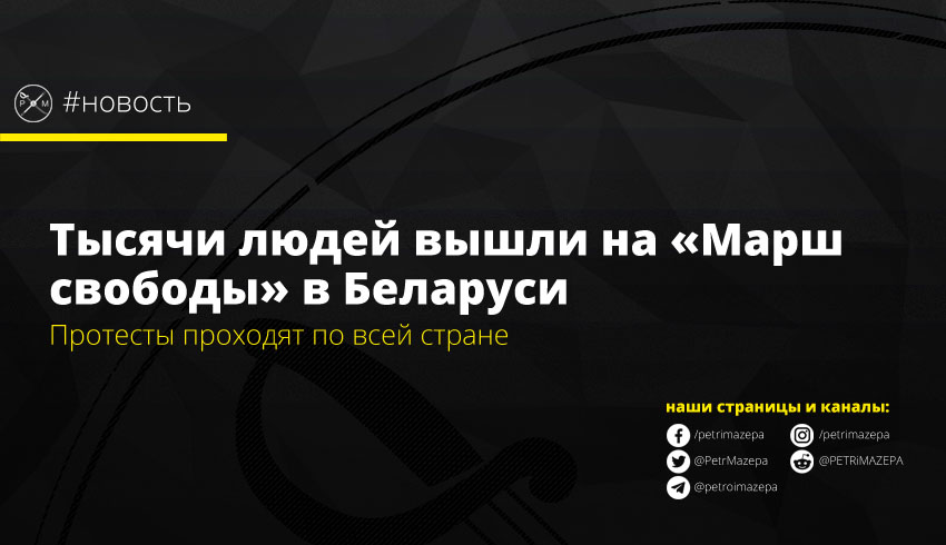 В Беларуси проходит «Марш Свободы» - протесты проходят по всей стране, в том числе в Минске, Гродно, Бресте и других городах. Telegram-канал Nexta сообщает что десятки тысяч людей продолжают подходить к Стелле в столице Беларуси Минске, там же к протестующим присоединилась представитель Тихановской Мария Колесникова.