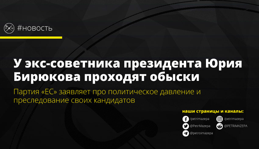 Партия «Европейская солидарность» заявили о проведении обысков у экс-советника президента Юрия Бирюкова. Отмечается, что обыски проводятся «по откровенно немотивированному решению суда», и партия считает их политическим давлением и преследованием по политическим мотивам.