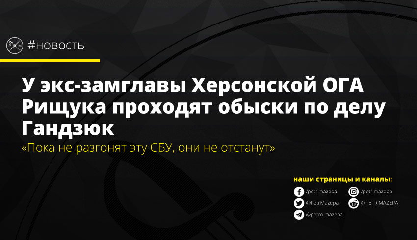 У экс-заместителя главы Херсонской ОГА Евгения Рищука проводят обыски по делу об убийстве Катерины Гандзюк. Сначала об этом сообщили журналисты, а потом и сам Рищук подтвердил факт проведения обысков, заявив, что «ничего не нашли», и что «это нужно для картинки».