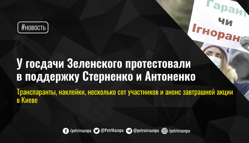 Сегодня у Конча-Заспы, где расположена государственная дача президента Владимира Зеленского, несколько сотен активистов требовали судебной реформы и освобождения политзаключенных, включая Сергея Стерненко и Андрея Антоненко.