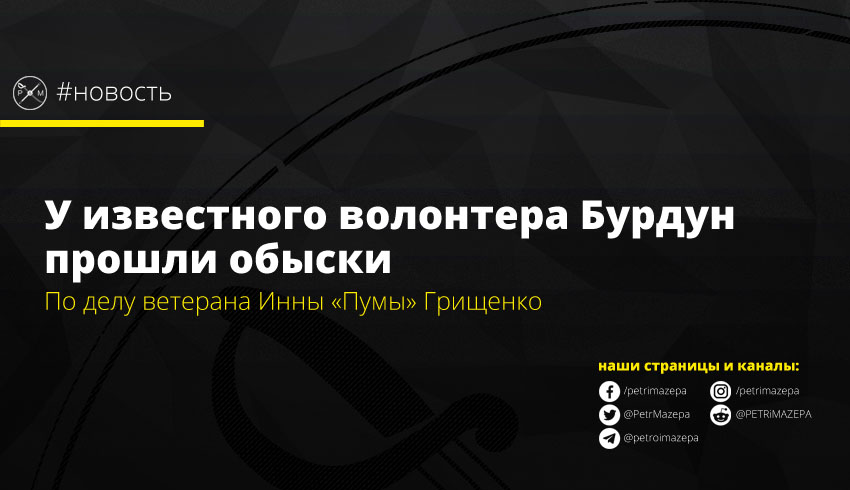 У известного волонтера, члена правления Союза ветеранов антитеррора, организатора акции «Накорми бойца» Марии Бурдун прошли обыски – обыскали как ее дом, так и дачу, и даже дом матери. Как сообщила сама Бурдун, обыски проводятся по делу ветерана Инны «Пумы» Грищенко, которая подозревается в покушении на бизнесмена из Ивано-Франковской области, и называлась в качестве фигуранта «дела Шеремета», но потом из дела ее фамилия, как и фамилия ее супруга исчезла.