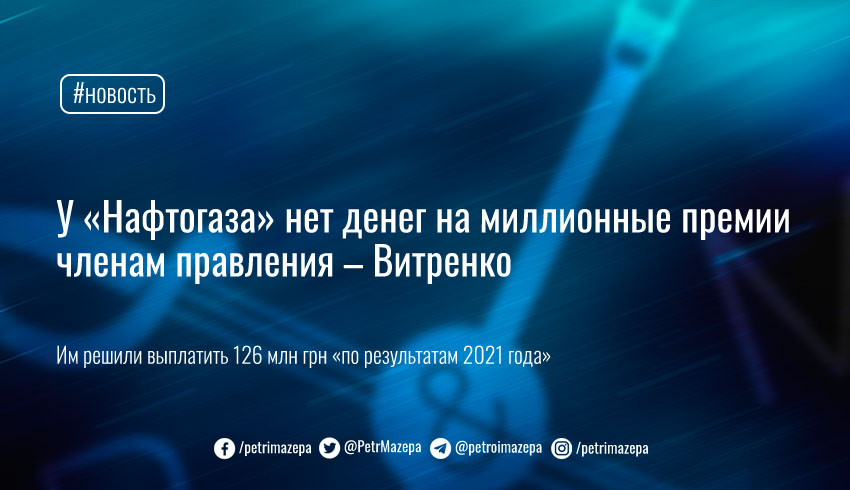 Поводом для обращения стало недавнее решение Наблюдательного совета «Нафтогаза» премировать членов правления Отто Арнольда Ватерландера, Петруса Стефануса ван Дрилла, Сергея Перелому и Ярослава Теклюка. Всего им назначено премий за этот год на 126 млн грн, и с учетом потенциальной выходной помощи (12 месячных окладов при увольнении) «Нафтогаз» должен зарезервировать для покрытия выплат около 215 млн грн. При этом Витренко подчеркивает, что размер премий определен за год, который еще не закончился. Однако Набсовет принял решение о том, что компания должна утвердить и подписать документы о предоставлении гарантий касательно этих выплат путем банковской гарантии, которую нельзя отозвать. В финансовом плане НАК «Нафтогаз» такие суммы не заложены, а при условии создания столь крупных резервов по результатам работы компании по первому кварталу может быть многомиллиардный убыток.