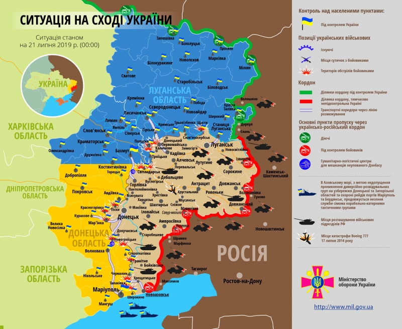 В Минобороны в дневном отчете сообщают, что «21 июля, обстрелов со стороны российско-оккупационных войск на линии боевого соприкосновения не зафиксировано. Защитники Украины неуклонно придерживаются «режима тишины». В то же время Командование Объединенных сил подчеркивает, что подразделения Объединенных сил адекватно отвечать на вражеские обстрелы в случае нарушения российскими оккупационными подразделениями режима прекращения огня и осуществления ими вооруженных провокаций и обстрелов наших позиций, или мирных населенных пунктов». Перед наступлением перемирия ситуация на фронте выглядела вот так.