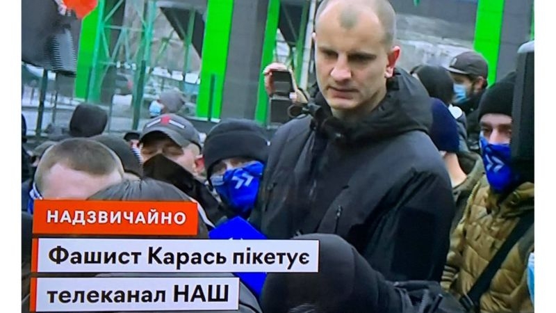 К протестующим вышли сотрудники «Нашего», которые пригласили лидеров протестующих обсудить ситуацию в студии, но те отказались, пишет «BBC Україна». Канал «Наш» транслировал акцию в прямом эфире и там Евгения Карася титровали как «фашиста».