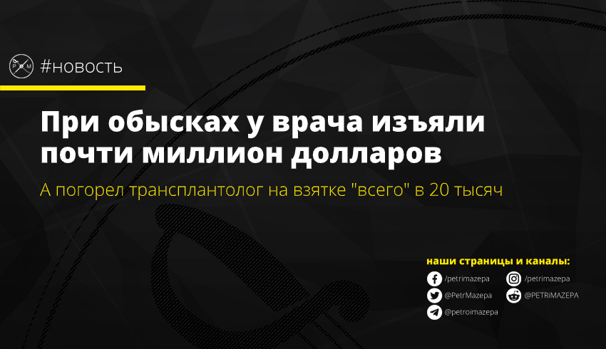 Вчера, 3 октября, стало известно, что прокуратура совместно с СБУ поймали заведующего отдела трансплантации и хирургии печени Национального института трансплантологии имени Шалимова на взятке в 20 тысяч долларов.  После этого произошли обыски в результате чего с его банковской ячейки изъяли 840 тысяч долларов, а в результате всех обысков примерно миллион.